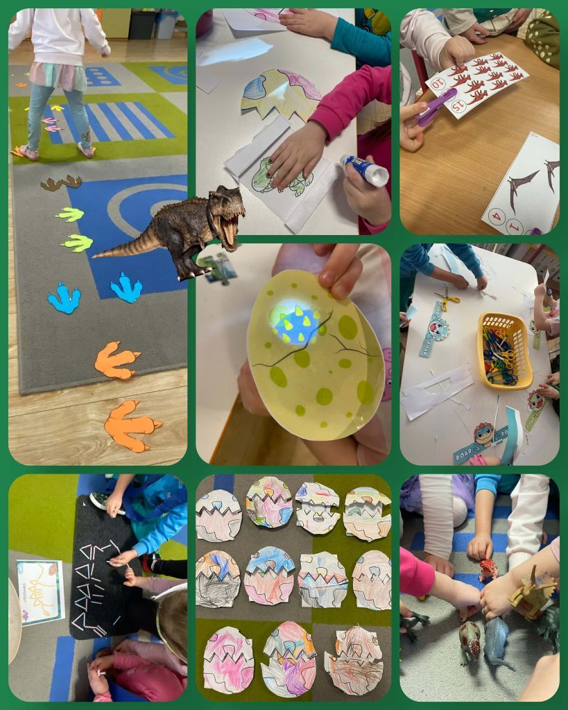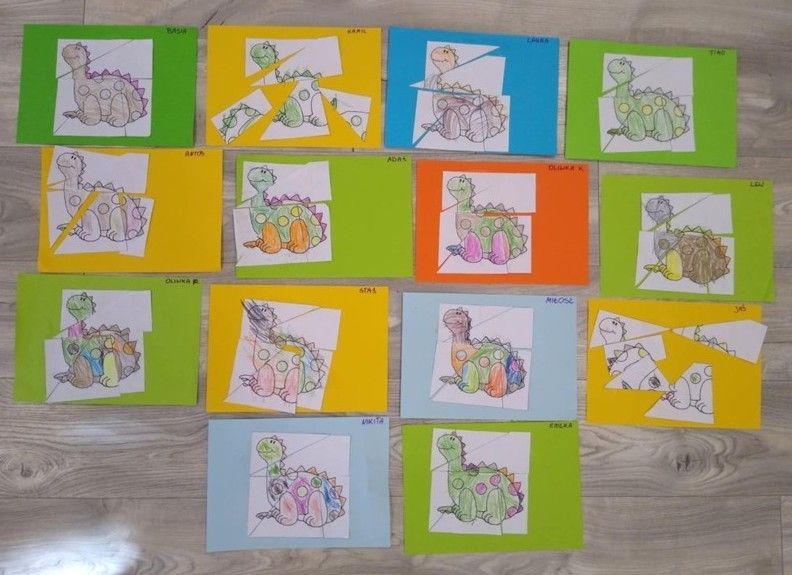 "Dinusie" to prace Motylków, dzieci układały obrazek z części i kolorowały.