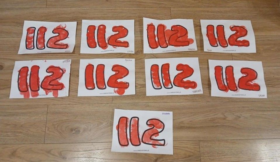 Nasze maluszki utrwaliły także znajomość numeru alarmowego 112 stemplując go czerwoną farbą.