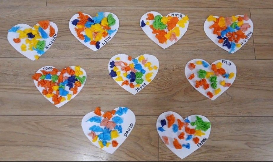 Dzieci wyklejały szablony serc kulkami krepiny.