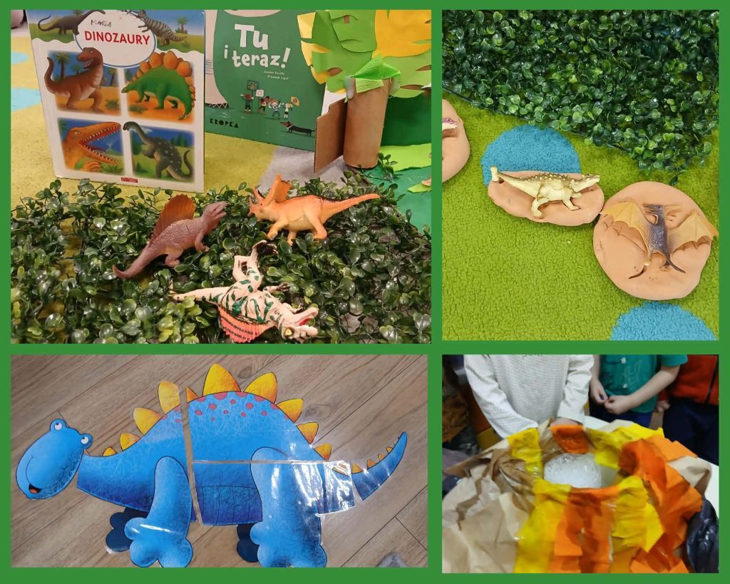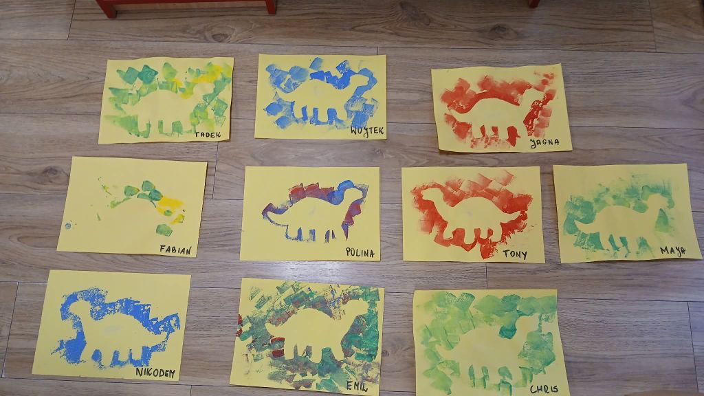 "Dinusie" to prace Motylków, dzieci układały obrazek z części i kolorowały.